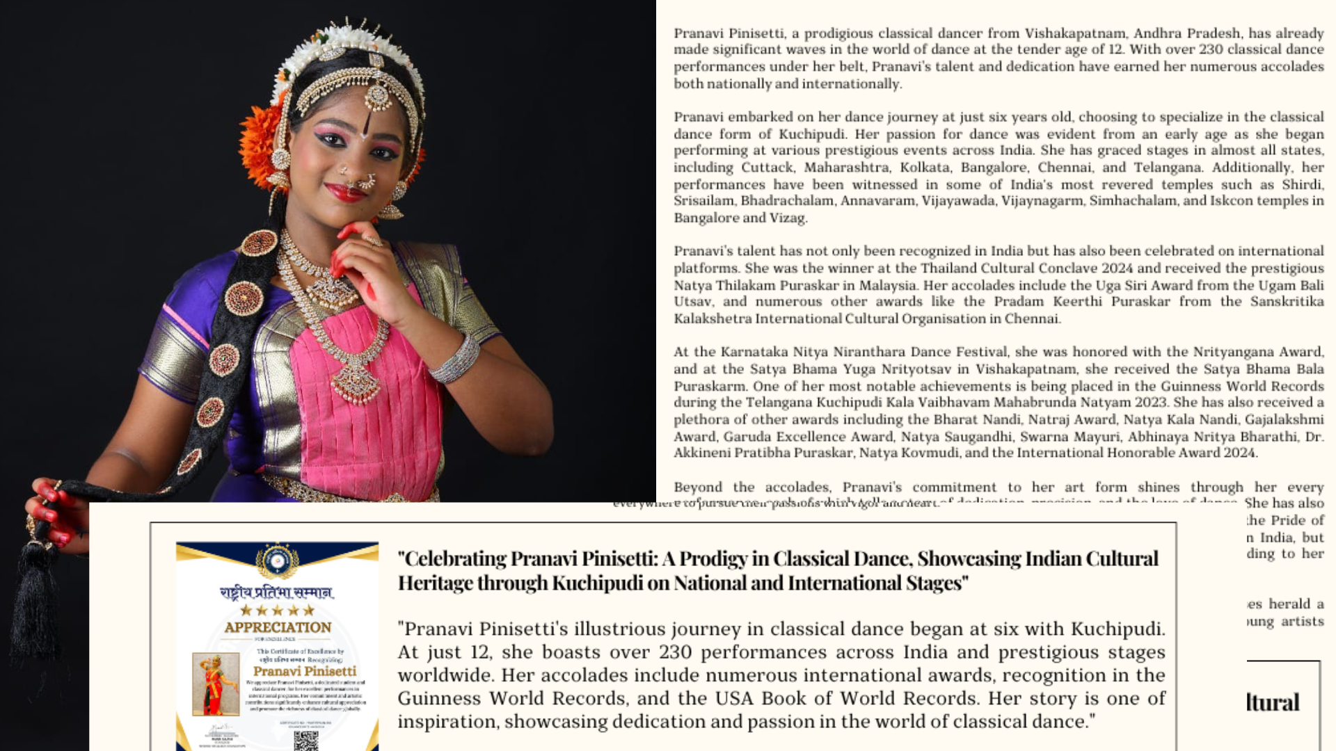 Pranavi Pinisetti, a prodigious classical dancer from Vishakapatnam, Andhra Pradesh, has already made significant waves in the world of dance at the tender age of 12. With over 230 classical dance performances under her belt, Pranavi’s talent and dedication have earned her numerous accolades both nationally and internationally.